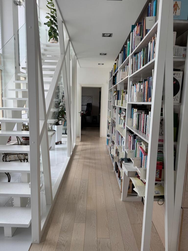 Parter - przepiękny salon z kominkiem, pięknie nasłoneczniony z wyjściem do pięknego ogrodu, aneks kuchenny, mała kuchnia - spiżarnia, gabinet, łazienka, przedpokój, piękna biblioteka, kotłownia, garaż dwustanowiskowy w bryle budynku