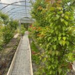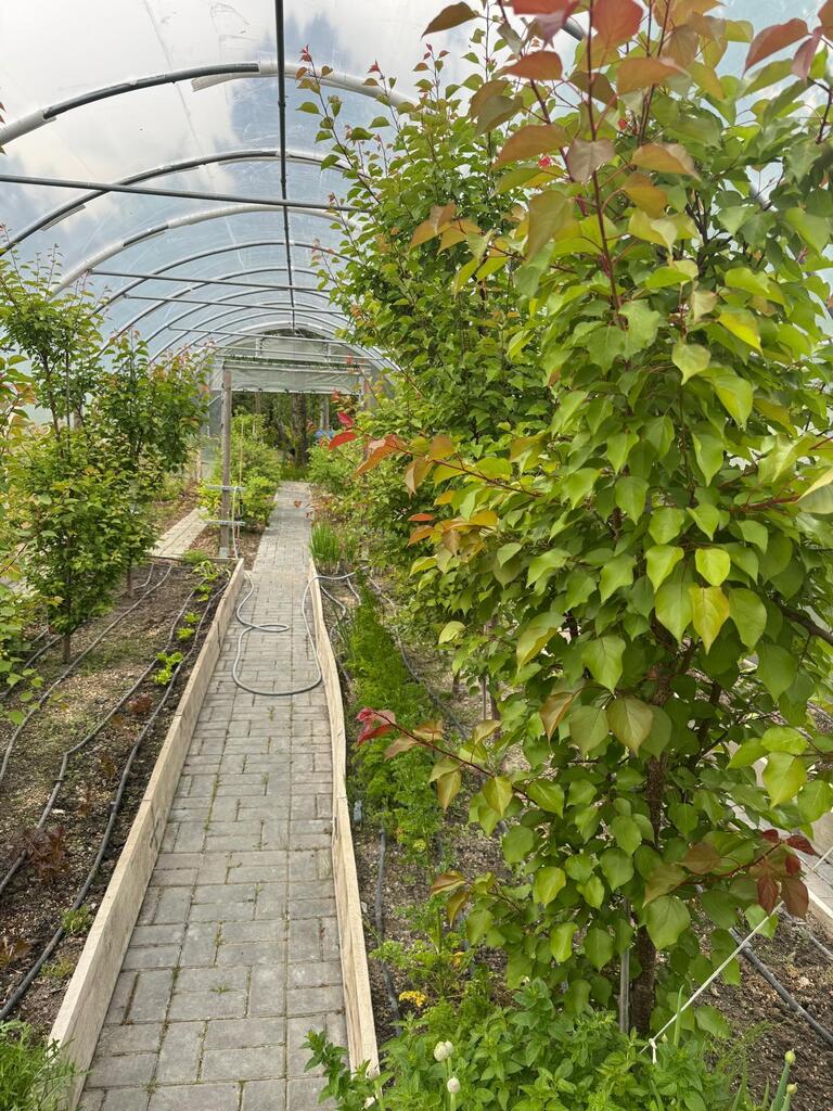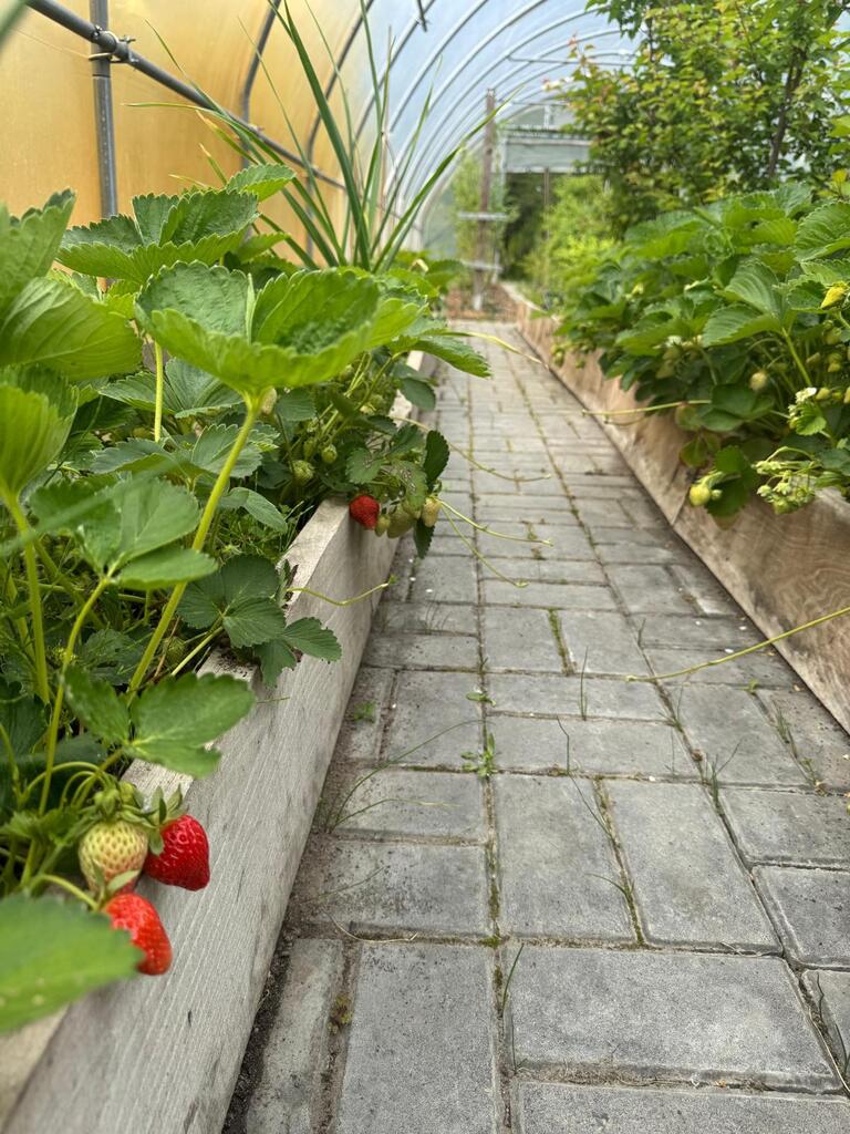 Duży namiot szklarniowy pod którym uprawiane są truskawki, jagody, pomidory, ogórki, brzoskwinie itd.