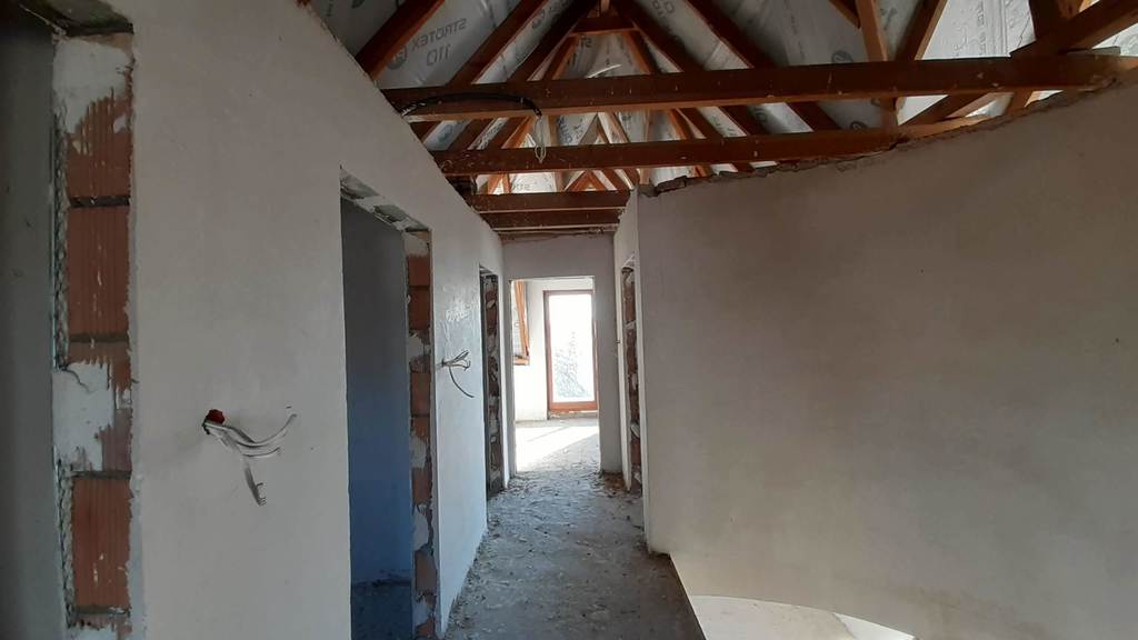 Budynek posiada tynki wewnętrzne (gipsowe) oraz jest wykonana instalacja elektryczna.