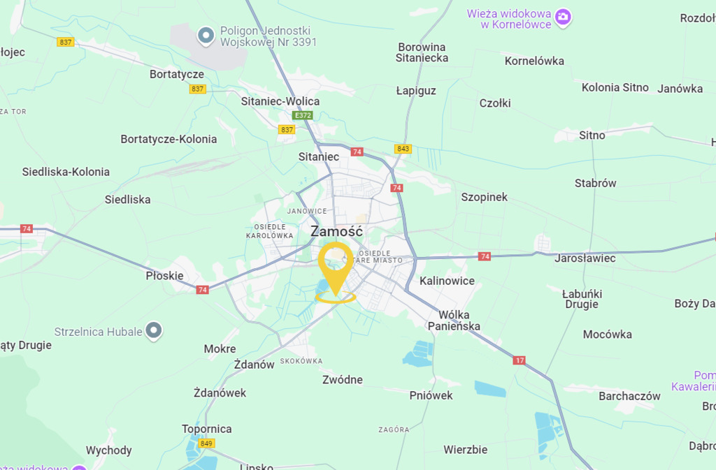 Dom wolnostojący, położony przy w centrum Zamościa, z bezpośrednim zjazdem z ulicy Lipskiej. Na parterze budynku, z osobnym wejściem od ulicy, znajdują się pomieszczenia w których można stworzyć swoje miejsce pracy. Bardzo dobra lokalizacja, przy głównej drodze wyjazdowej z miasta w kierunku Krasnobrodu, gwarantuje dużą rozpoznawalność prowadzonej tu działalności.