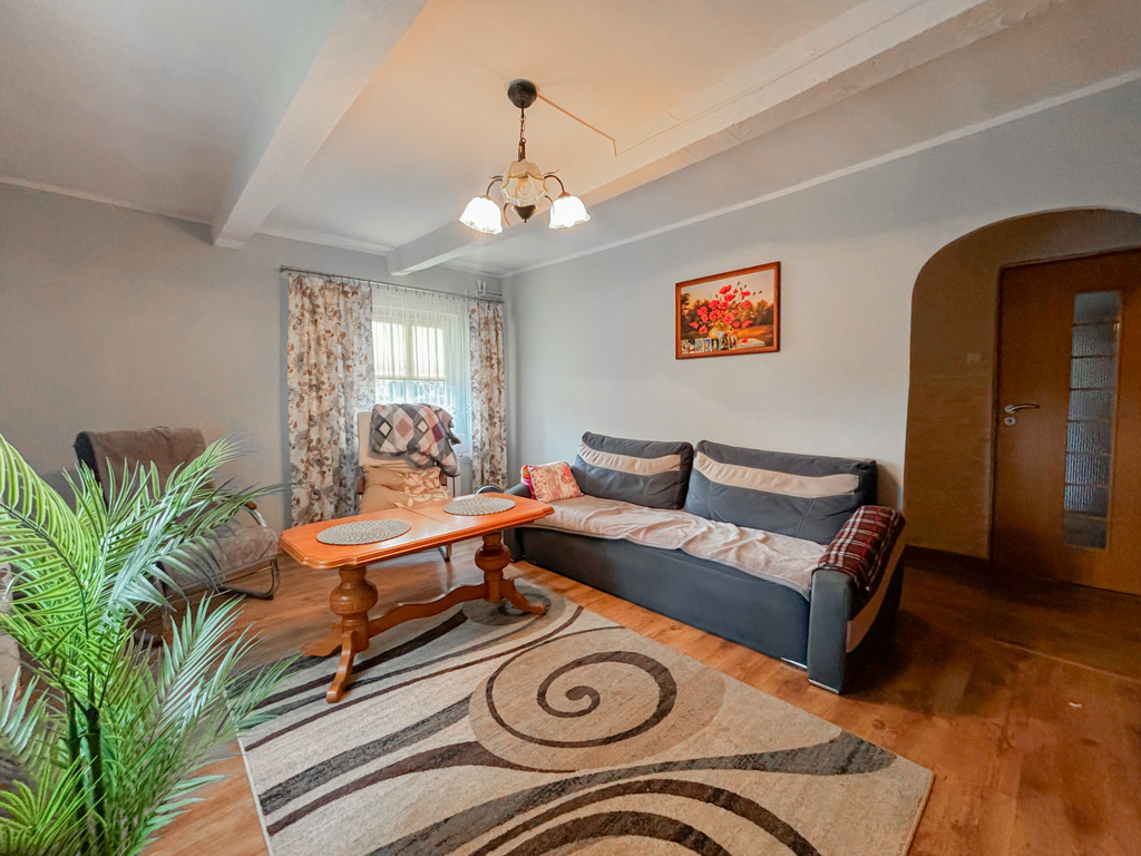Parterowy dom o powierzchni około 70m2 usytuowany jest na 2400 m2 działce, otoczonej zielenią z dala od miejskiego zgiełku i bezpośredniego sąsiedztwa.