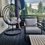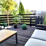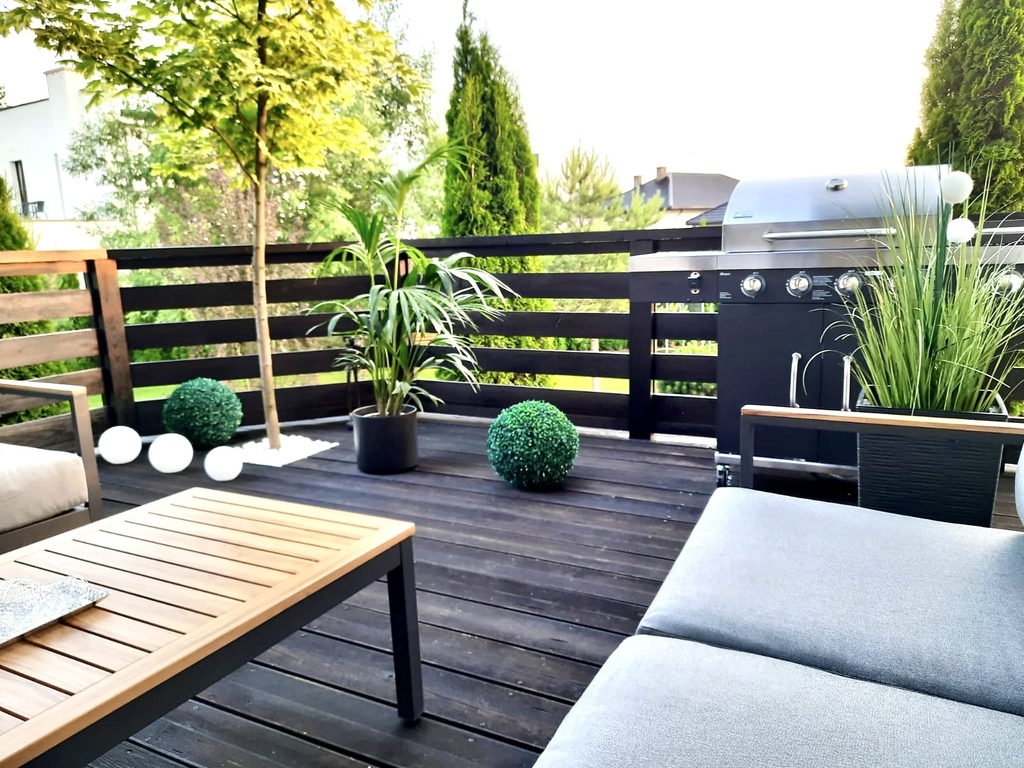 -Przestronnego salonu z wyjściem na drewniany taras z balustradą