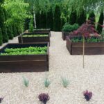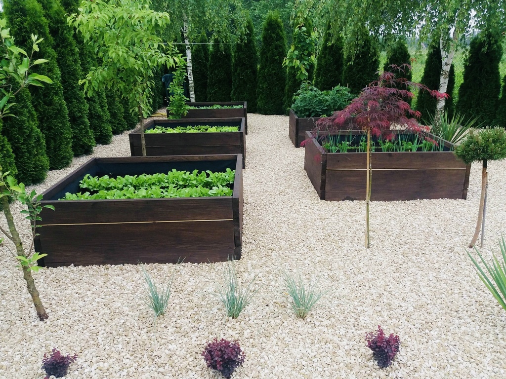Zarybiony staw o powierzchni 250 m2 oraz ogrodód warzywny w skrzyniach.