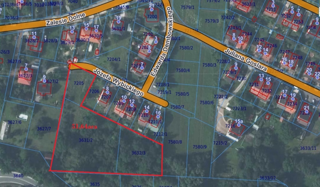 51,64 ara, położona w spokojnej i zielonej części Bochni – Zalesiu Dolnym (Ul. Józefa Wybickiego)