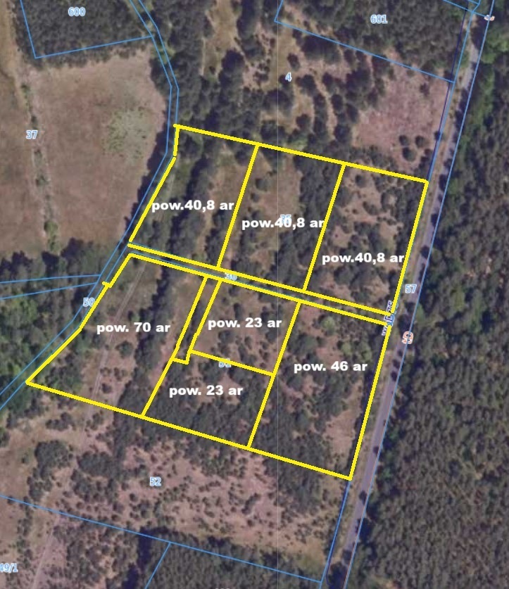 Obecnie działka stanowi jeden areał o pow. 1,27 ha. Istnieje wstępny projekt podziału, wg którego możliwe jest wydzielenie wybranej wielkości działki, co nastąpi po podpisaniu umowy przedwstępnej przez przyszłego Nabywcę.