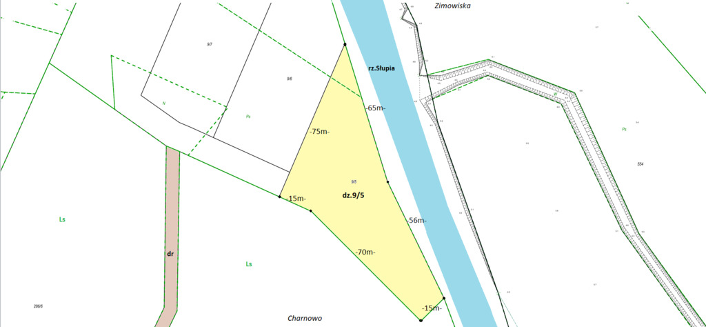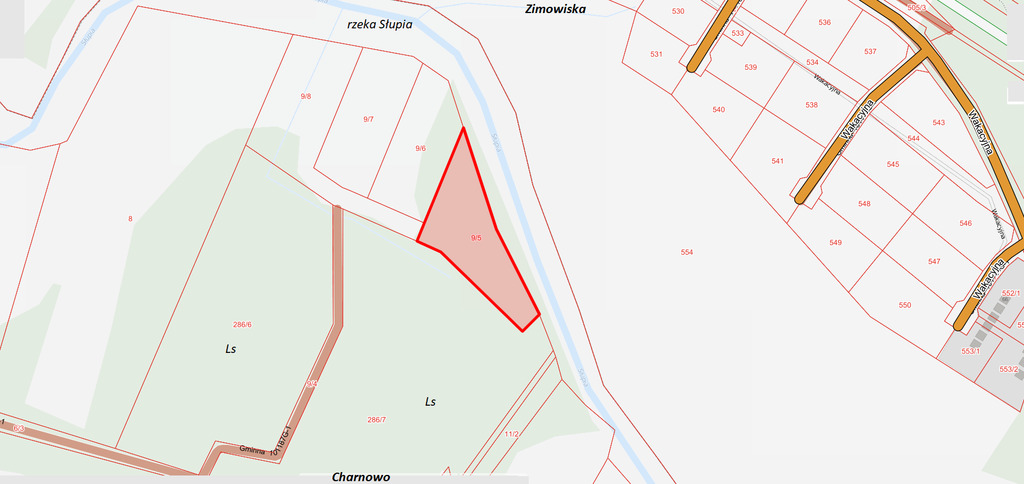 Na sprzedaż działka położona bezpośrednio przy rzece Słupi, zaledwie 2,5 km od miasta Ustki. Powierzchnia działki to 3374 m2, w ewidencji gruntów oznaczona jako Ps, pastwisko. Działka w otoczeniu lasów, z ponad 100 metrowa linią brzegową rzeki Słupi. Teren w większości pokryty młodymi drzewami, głównie dąb i buczyna. Dojazd do działki drogą gminną gruntową przecinającą las. Nieruchomość na skraju wsi Charnowo w gminie Ustka. Na danym terenie brak jest MPZP. Miejsce idealne dla wędkarzy, osób szukających ciszy i spokoju oraz kontaktu z naturą.