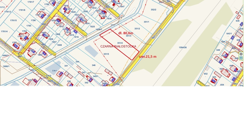 Wymiary działki: ok. 21,5 m szerokości i 80,6 m długości – dają wiele możliwości aranżacji przestrzeni i budowy wymarzonego domu.