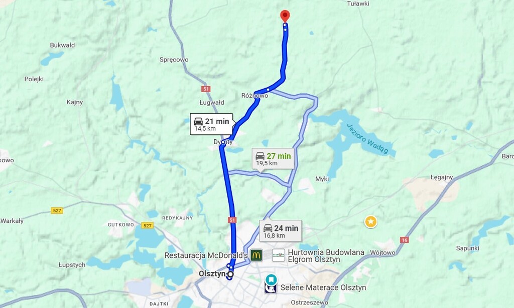 Do pobliskich Dywit samochodem można dojechać w 10 min (7 km), do Olsztyna w 22 min. (15 km).