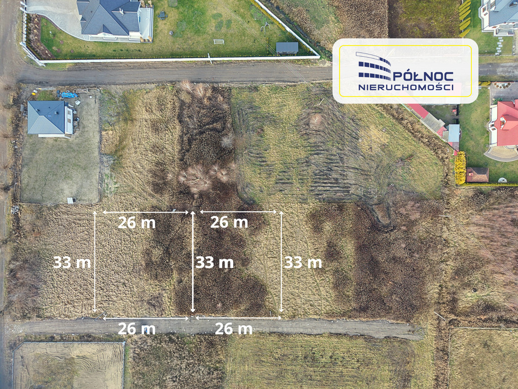 34 × 26 m, co daje możliwość zakupu zarówno pod budowę domu jednorodzinnego, jak i zabudowę bliźniaczą lub inwestycję.
