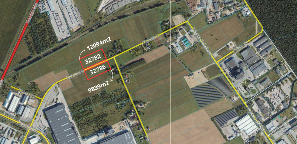 - Działka większa: 1,2094 ha (ok. 73 x 160 m)