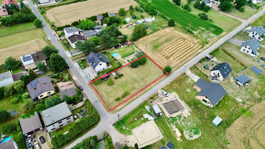 Kształt i wymiary: Prostokątna, rogowa działka o wymiarach 29,5 m x 49 m – idealna na budowę wymarzonego domu lub nawet dwóch budynków.