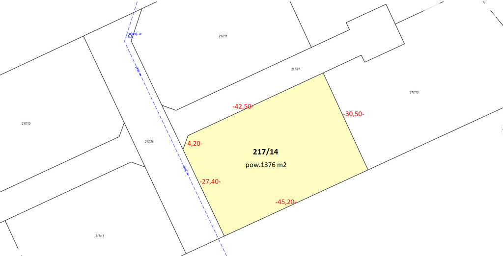 - działka w kształcie prostokąta o wymiarach 42,60m x 30,50m