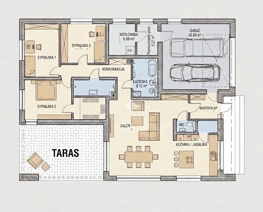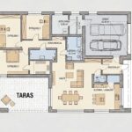 Projekt przewiduje budynek parterowy o przemyślanym układzie pomieszczeń, obejmującym przestronny salon z jadalnią i wyjściem na taras, oddzielną kuchnię, 3 sypialnie oraz zaplecze gospodarcze i garaż w bryle budynku. Budynek posiada czytelny podział na strefę dzienną i prywatną, co zwiększa komfort codziennego użytkowania, a prosta bryła oraz dach wielospadowy wpływają na ekonomię budowy i eksploatacji. Elewacje budynku zakładają nowoczesną, stonowaną formę z dużymi przeszkleniami od strony ogrodu, co zapewnia dobre doświetlenie wnętrz .