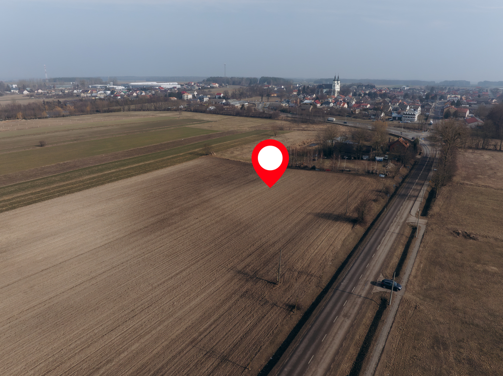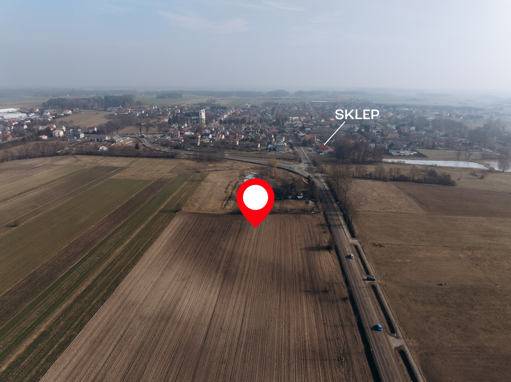 Nieruchomość znajduje się tuż przy drodze powiatowej, co zapewnia łatwy dojazd i świetną widoczność – kluczowe atuty dla potencjalnej działalności gospodarczej. Jednocześnie okolica zachowuje swój spokojny charakter, co sprawia, że teren świetnie nadaje się także pod budownictwo jednorodzinne.