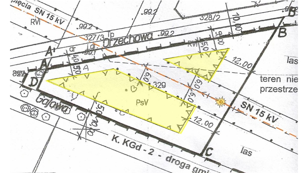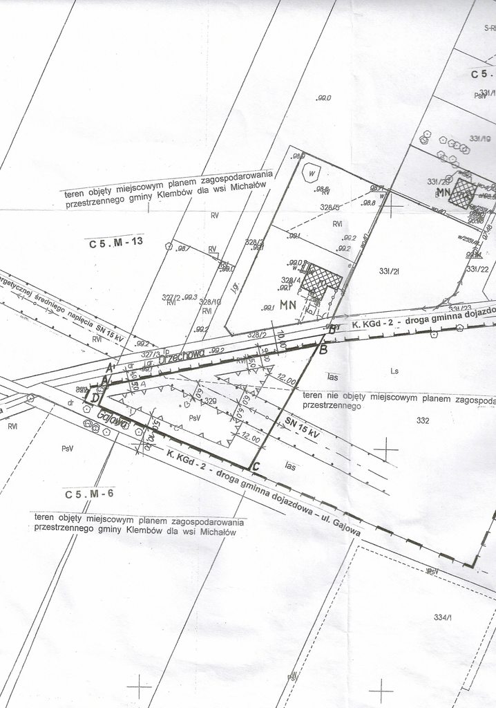 - nieprzekraczalna linia zabudowy - od ul. Orzechowej w odległości min 5 m od granicy działki ( według mpzp. dla miejscowości Michałów) oraz od ul. Gajowej w odległości min. 5,00 m od granicy działki, oraz od napowietrznej linii elektroenergetycznej średniego napięcia SN 15 kV odległości min. 6,00 m od osi tej linii, po obu stronach, według oznaczenia graficznego na załączonej mapie geodezyjnej;