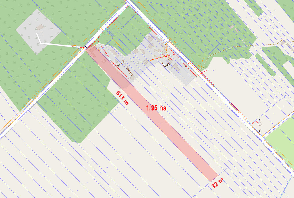 - szerokość działki ok. 32 m, długość ok. 613 m
