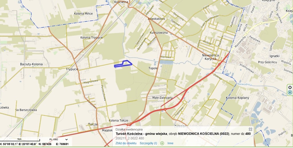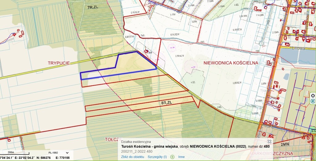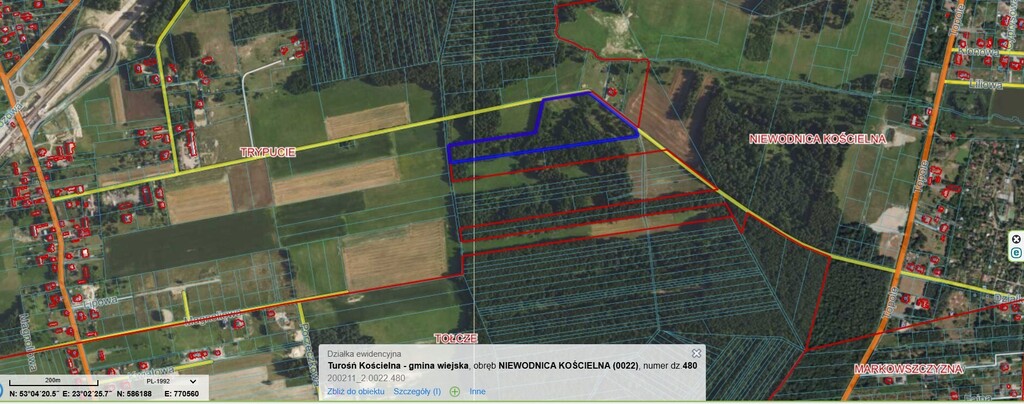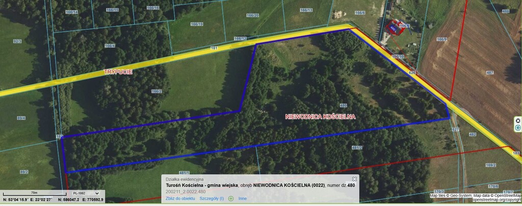 Polecamy piękną obszerną działkę powierzchni 2,8899 ha w Niewodnicy Kościelnej przy drodze do miejscowości Trypucie w gm. Turośń Kościelna.