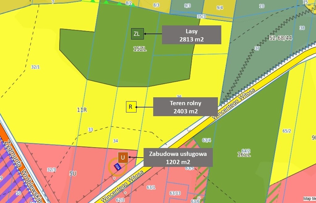 Miejscowy plan zagospodarowania przestrzennego (MPZP) dzieli działkę na trzy funkcje:
