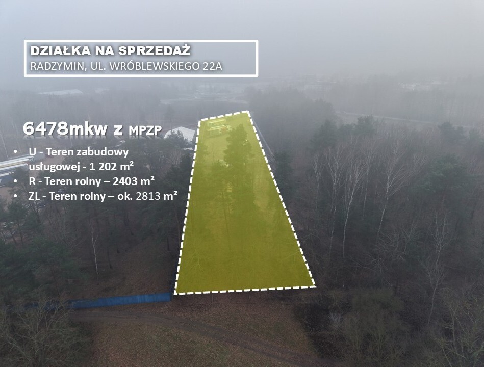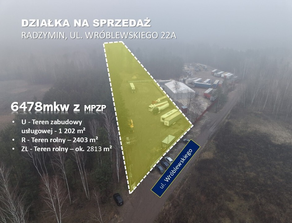 Na sprzedaż działka inwestycyjna w Radzyminie – ul. Wróblewskiego 22A, działka nr 34 (obręb 01-02) o powierzchni 6 478 m², zlokalizowana w rejonie przemysłowym miasta (okolice zakładów Coca-Cola). Nieruchomość jest ogrodzona betonowym murem i przygotowana do intensywnego użytkowania: posiada monitoring, alarm oraz oświetlenie. Obecnie teren funkcjonuje jako parking dla samochodów ciężarowych.