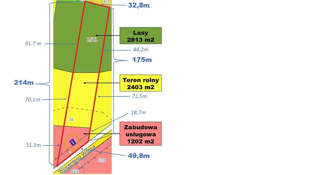 Wymiary orientacyjne: front ok. 49,8 m, boki ok. 214 m i 175 m, tył ok. 32,8 m.