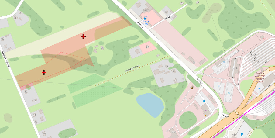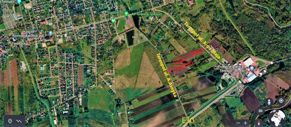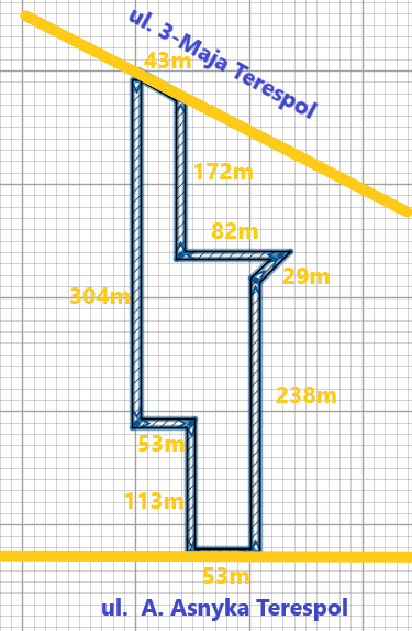Od ul. 3-go Maja szerokość działki 43m- jest to droga znajdująca się 800m od przejścia Granicznego z Białorusią (Terespol- Brześć).