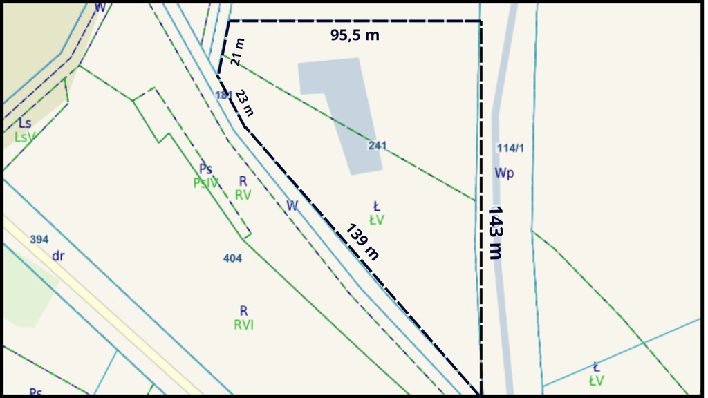 łąki (ŁIV i ŁV). Teren zróżnicowany, dobrze nasłoneczniony, dojazd drogą polną. Działka graniczy bezpośrednio z rzeką Udal, na jej terenie znajduje się staw i drewniany domek narzędziowy, liczne trzcinowiska. Obszar nie objęty MPZP.