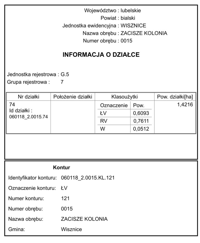 Powierzchnia działki wynosi 1,4216 ha, działka nr 74