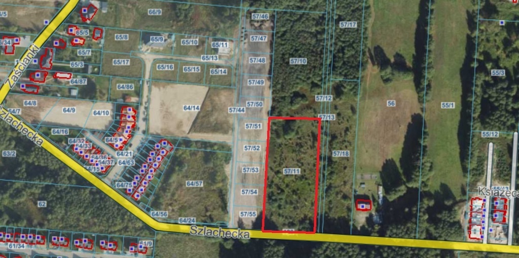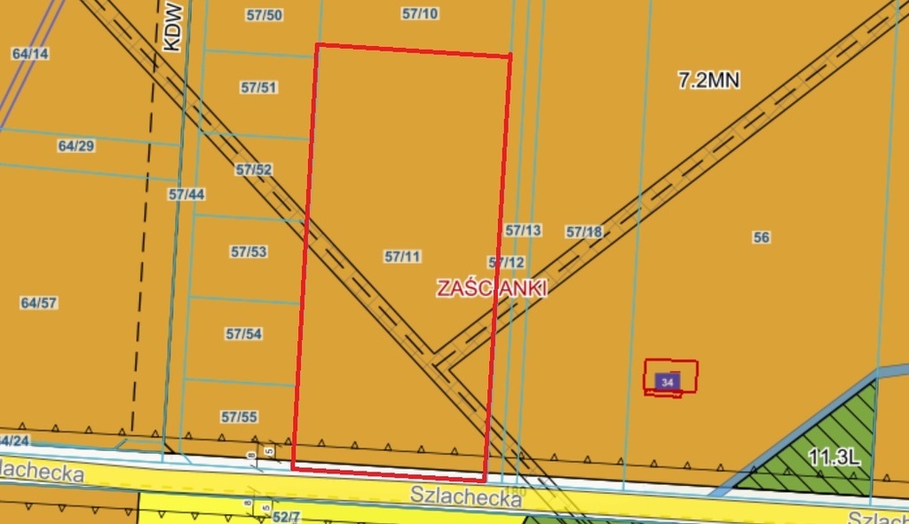 Nieruchomość w kształt prostokąta o wymiarach 57 m x 127 m i powierzchnię 7411 m2.
