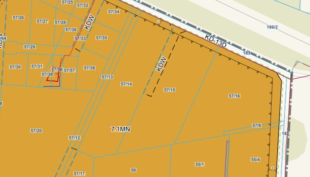 Nieruchomość w kształcie prostokąta z jednym ściętym bokiem o powierzchni 5092m2 i wymiarach 35 m, 149 m, 18 m, 21 m, 137 m.