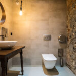 Toaleta dla gości, pomieszczenie gospodarcze wraz z toaletą dla personelu i druga sala dla gości ze stołami i krzesłami.