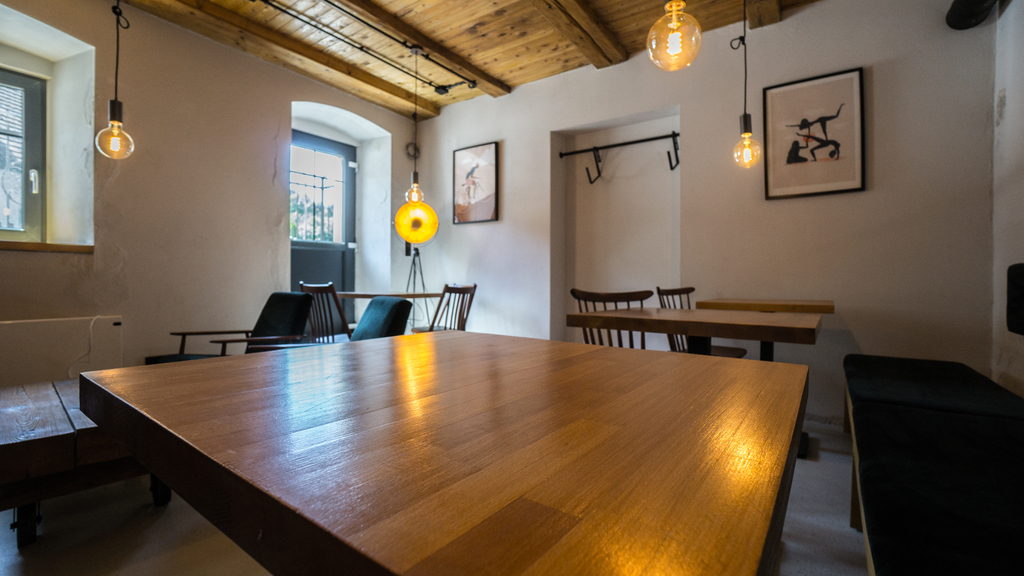 Kawiarnia z wejściem bezpośrednio z chodnika przy głównej uliczce ma powierzchnię 51,6m2 i składa się z sali głównej z barkiem oraz zapleczem do zwywania naczyń.