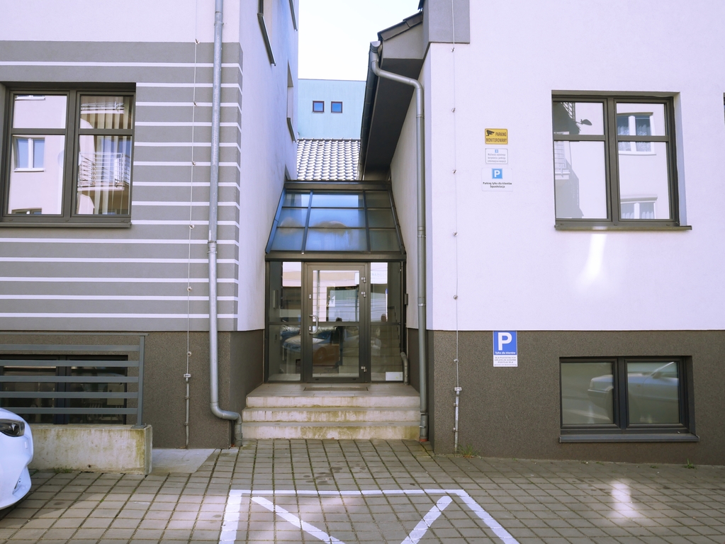 - Prezentowana nieruchomość posiada trzy wejścia oraz osiemnaście miejsc parkingowych na parkingu należącym do przedmiotowej nieruchomości.