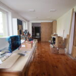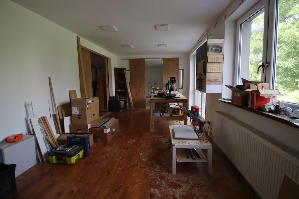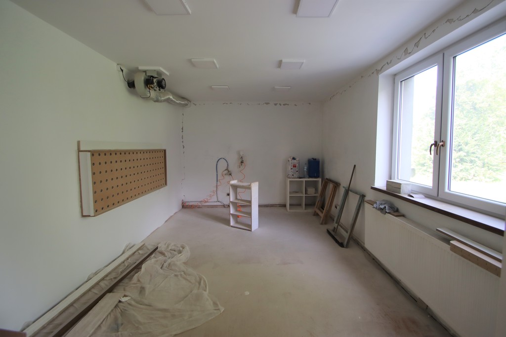 - w budynku okna PCV, ściany wygładzone, podłogi z paneli lub płytek, w pomieszczeniu piwnicznym posadzka betonowa