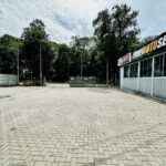 - duży parking z kostki brukowej przed budynkiem na około 20 aut
