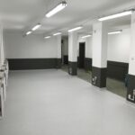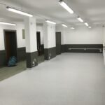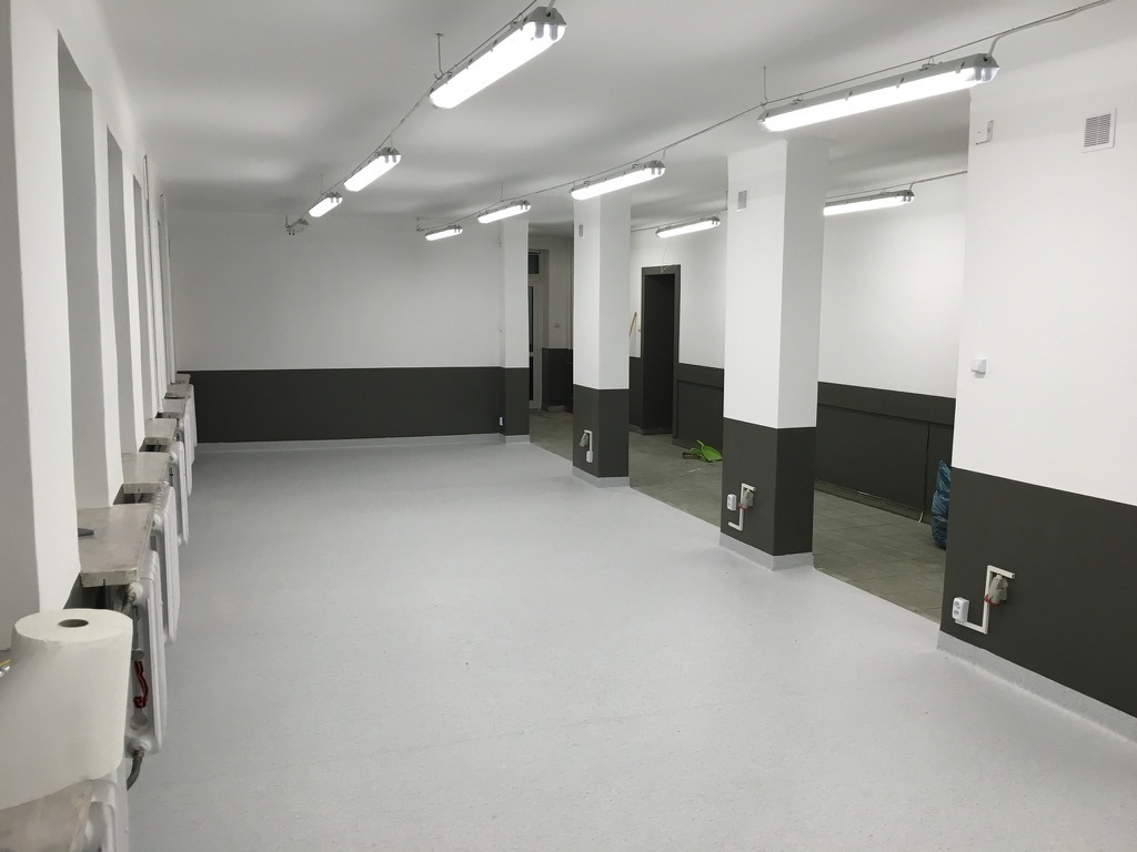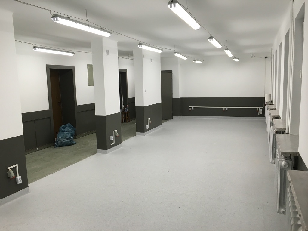 Szatnia pracownicza w piwnicy budynku, zapewniająca wygodne miejsce do przechowywania odzieży i innych osobistych rzeczy.
