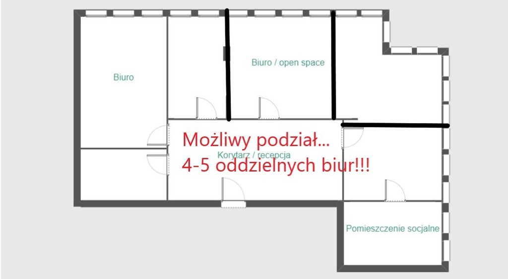 Wnętrze lokalu można zaaranżować pod Państwa potrzeby aby spełniły oczekiwania współczesnych przedsiębiorstw. Możliwość uzyskania 5-6 oddzielnych biur.