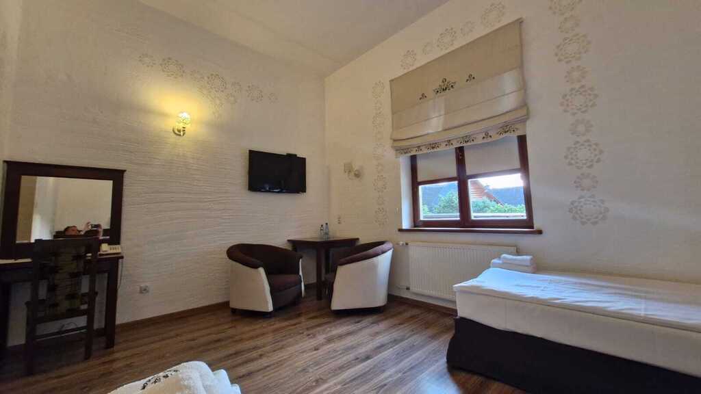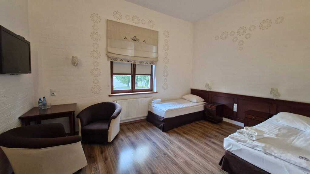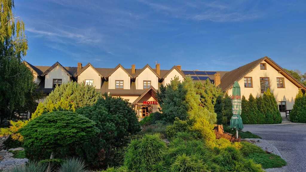 • Hotel murowany z 26 pokojami, w tym 2 apartamenty. Dodatkowo: własny bar oraz w pełni wyposażona sala konferencyjna na 200 osób.
