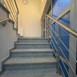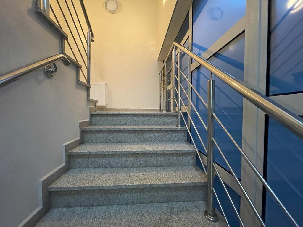 Na klatce schodowej - schody betonowe, zabiegowe, monolityczne, obłożone płytami granitowymi; balustrady stalowe, niklowane. Przeszklenie przyciemniane na profilach aluminiowych. W częściach sanitarnych terakota i glazura do wysokości około 2 m.
