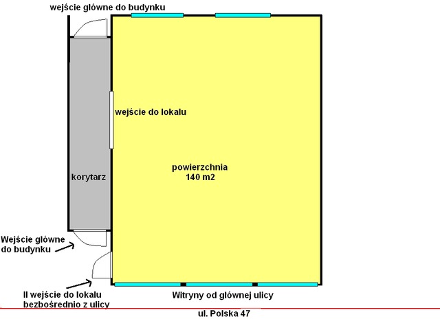 Lokal z witrynami znajduje się na parterze w budynku 3 kondygnacyjnym z 2 wejściami - od ulicy oraz z korytarza.