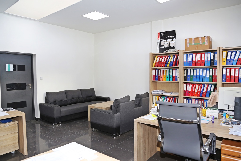 Część biurowa w świetnym stanie technicznym, spełnia wszystkie normy sanitarne, p. poż. i BHP.