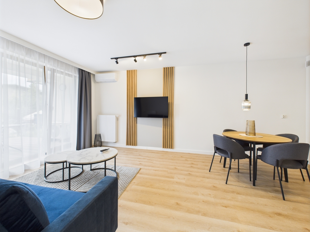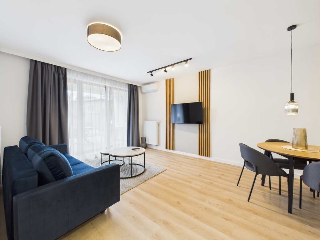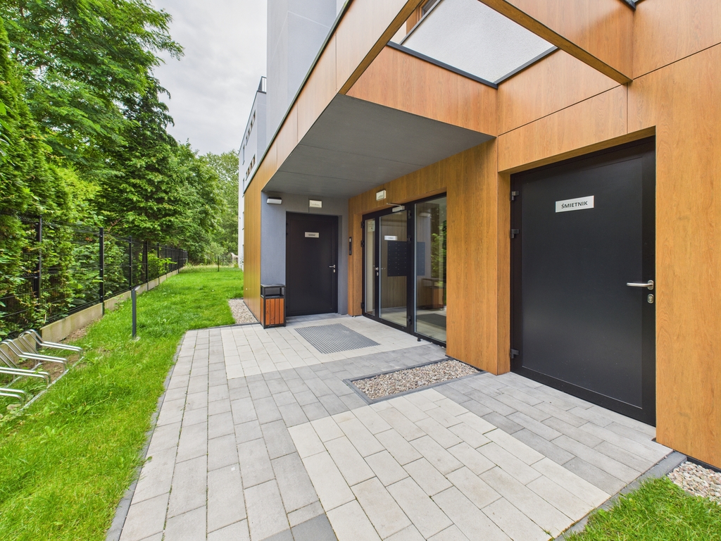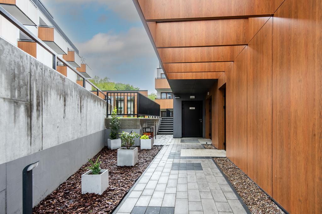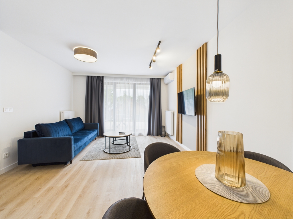 Apartamenty dostępne w stanie deweloperskim z możliwością wykończenia pod klucz (od 3 000 zł/m² brutto). Kompleks składa się z dwóch budynków (4- i 3-piętrowego) wyposażonych w strefę SPA z sauną, siłownię, halę garażową oraz komórki lokatorskie. Teren inwestycji obejmuje zagospodarowane przestrzenie zielone. Gotowe lokale umożliwiają natychmiastowe rozpoczęcie wynajmu.