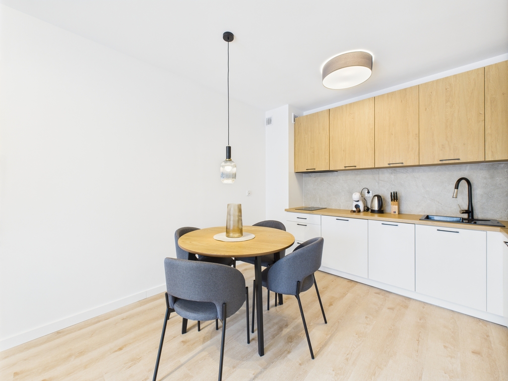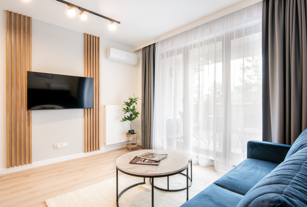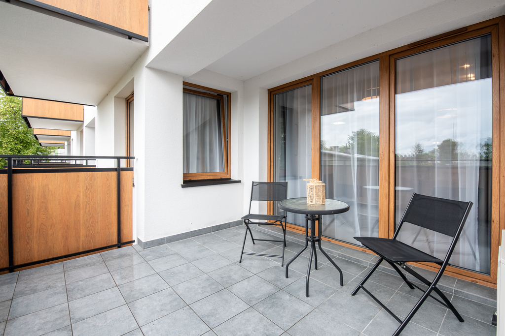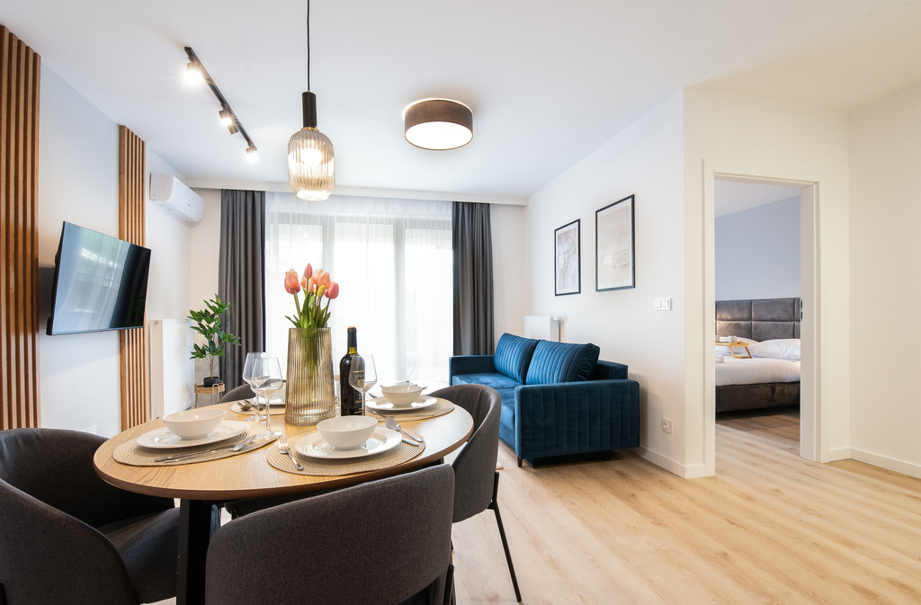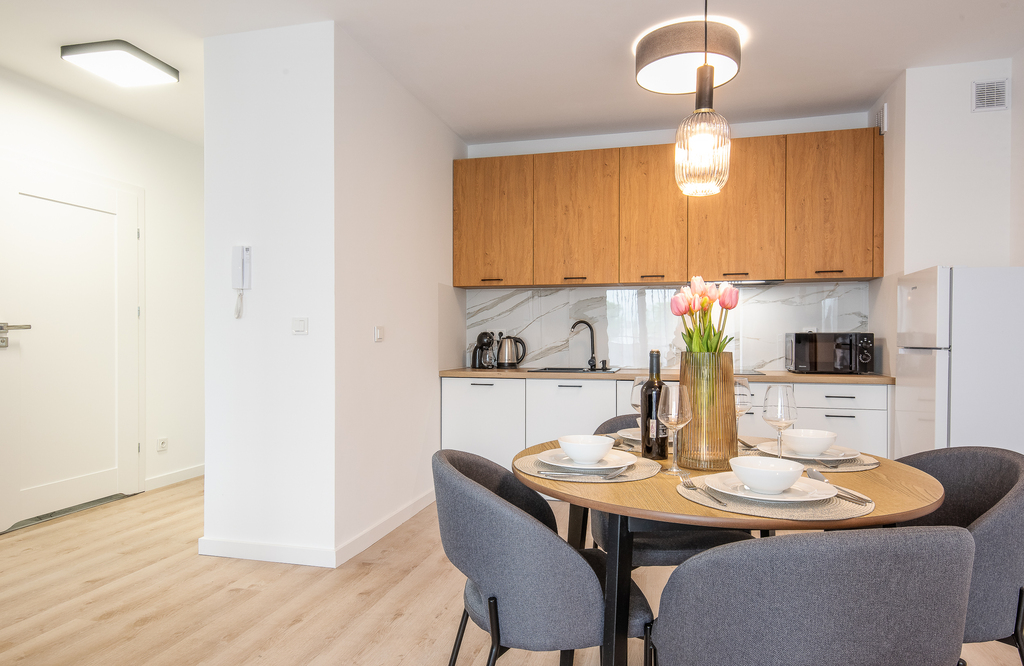 Apartamenty dostępne w stanie deweloperskim z możliwością wykończenia pod klucz (od 3 000 zł/m² brutto). Kompleks składa się z dwóch budynków (4- i 3-piętrowego) wyposażonych w strefę SPA z sauną, siłownię, halę garażową oraz komórki lokatorskie. Teren inwestycji obejmuje zagospodarowane przestrzenie zielone. Gotowe lokale umożliwiają natychmiastowe rozpoczęcie wynajmu.