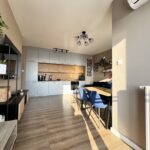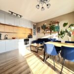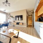 Kuchnia jest wyposażona w zabudowę kuchenną wraz z markowym sprzętem AGD, w tym m.in. piekarnik, płyta indukcyjna, lodówka w zabudowie, zmywarka.