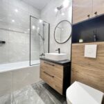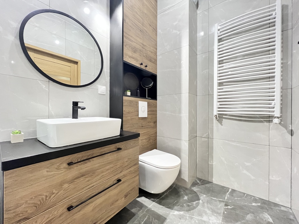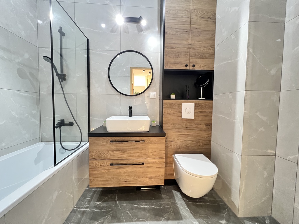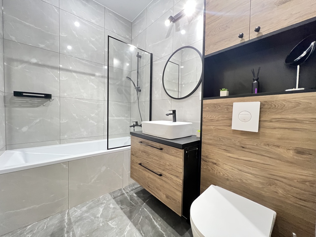 Łazienka została wykończona według designerskiego projektu łączącego klasyczny styl z nowoczesnymi trendami panującymi we współczesnym budownictwie.