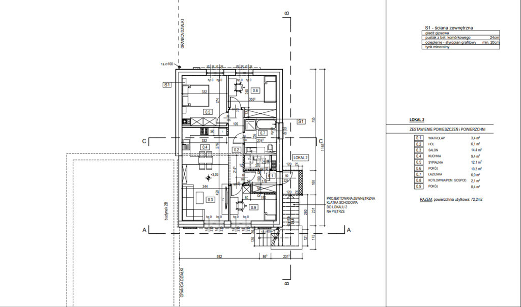 Apartament o powierzchni 77,2 m2 usytuowany jest na pierwszym piętrze w budynku szeregowym i składa się z: