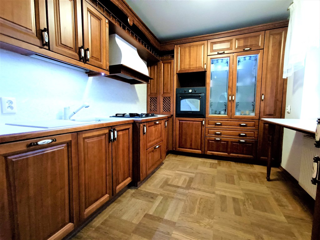Kuchnia z zabudową kuchenną oraz wszystkim sprzętem AGD (lodówka, piekarnik, płyta gazowa, zlewozmywak oraz zmywarka.