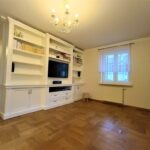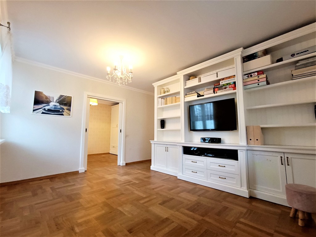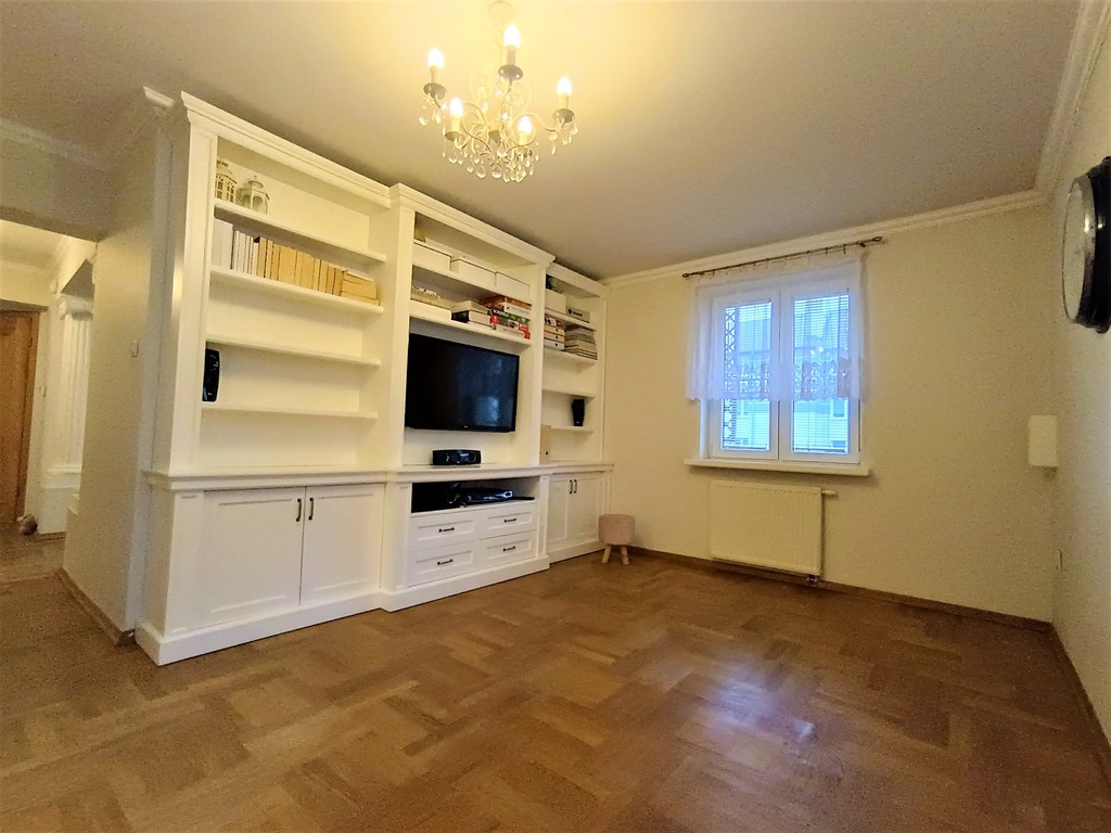 Salon z zabudowaną szafą wraz z TV, oraz kinem domowym.