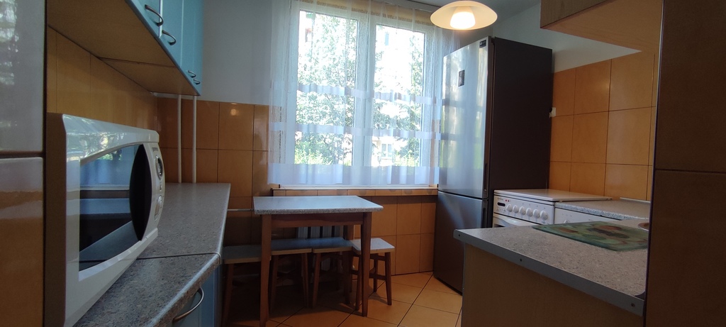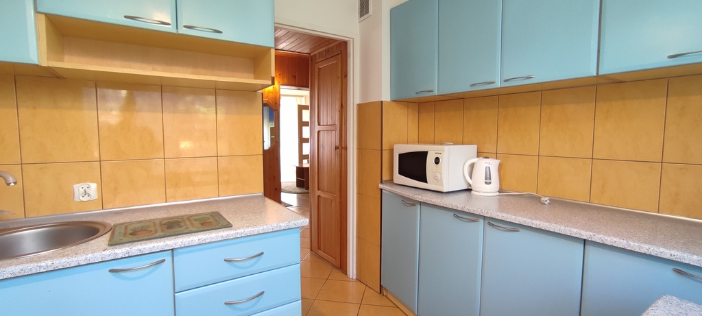 Umeblowana i wyposażona kuchnia: lodówka, kuchenka gazowa z piekarnikiem, okap, zmywarka, mikrofalówka.
