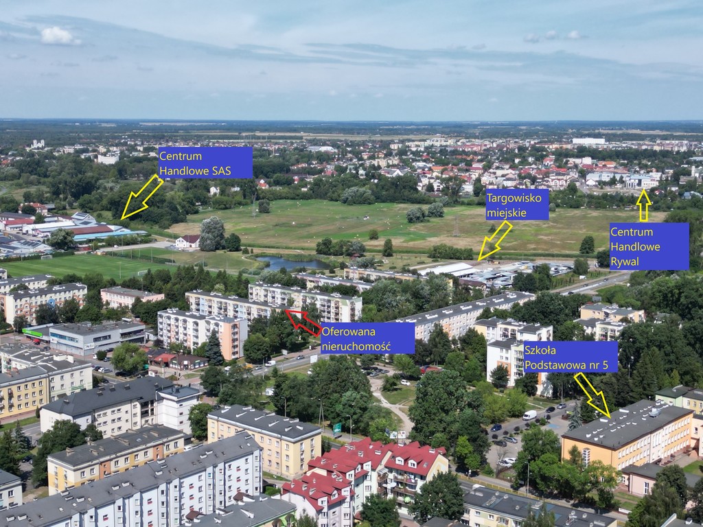 W pobliżu sklepy spożywcze, szkoła, kościół, bank, ryneczek, centrum handlowe, przychodnia.
