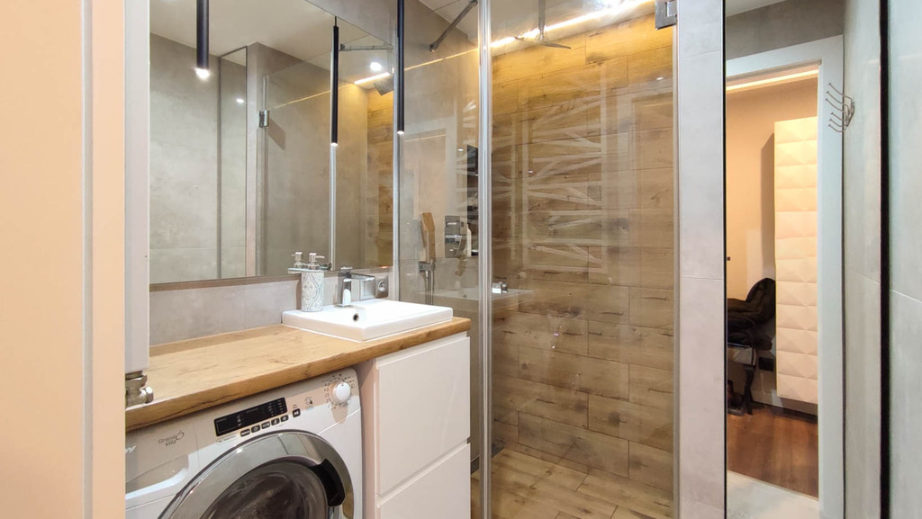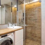 W łazience pralka.